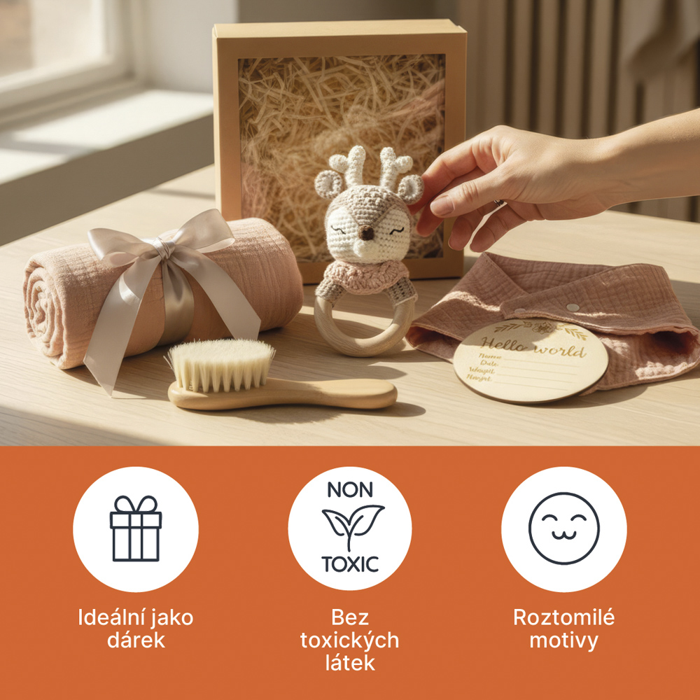 Elegantní dárkový set pro miminko v přírodním stylu obsahující ručně háčkované kousátko, mušelínovou plenku, jemný kartáč z přírodních štětin, slintáček a dřevěnou pamětní kartičku *Hello World*, vyrobený z bezpečných materiálů a připravený v stylové krabičce k okamžitému darování.