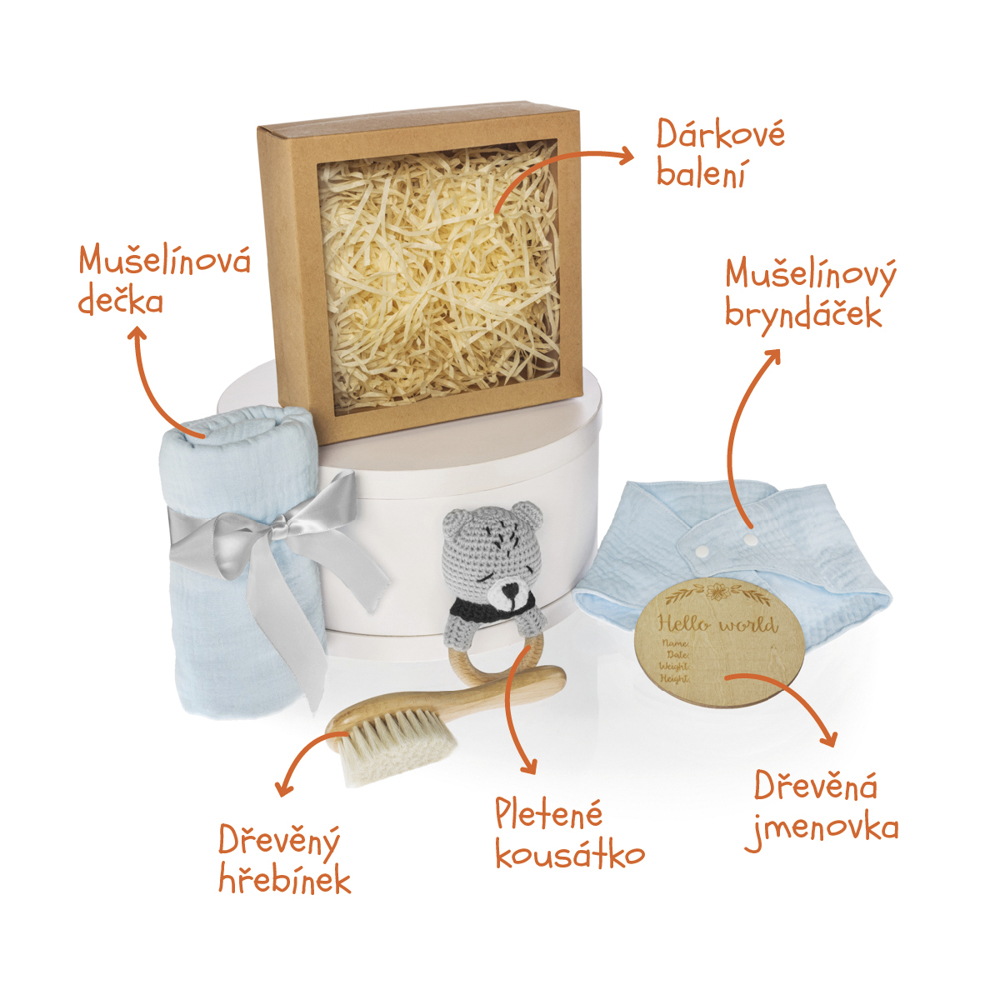 Elegantní dárkový box pro novorozence v přírodním stylu. Obsahuje ručně háčkované kousátko, měkoučkou mušelínovou plenku, jemný kartáč z přírodních štětin šetrný k citlivé dětské pokožce, slintáček a dřevěnou pamětní kartičku Hello World pro zaznamenání prvních údajů o miminku.