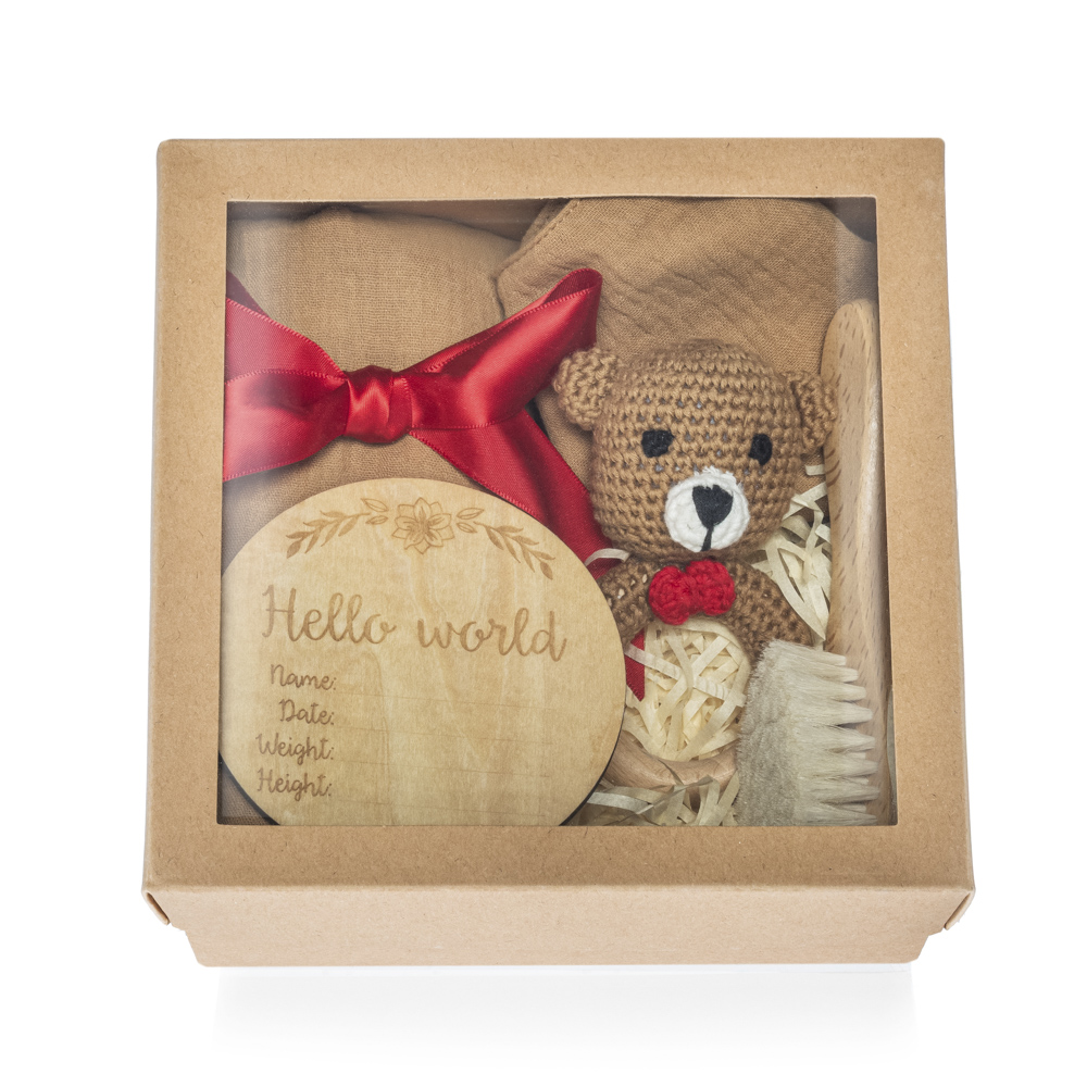 Elegantná darčeková krabička pre novorodenca v prírodnom štýle. Obsahuje ručne háčkované hryzátko, mäkučkú mušelínovú plienku, jemný štetec z prírodných štetín šetrný k citlivej detskej pokožke, slintáčik a drevenú pamätnú kartičku *Hello World* na zaznamenanie prvých údajov o bábätku.