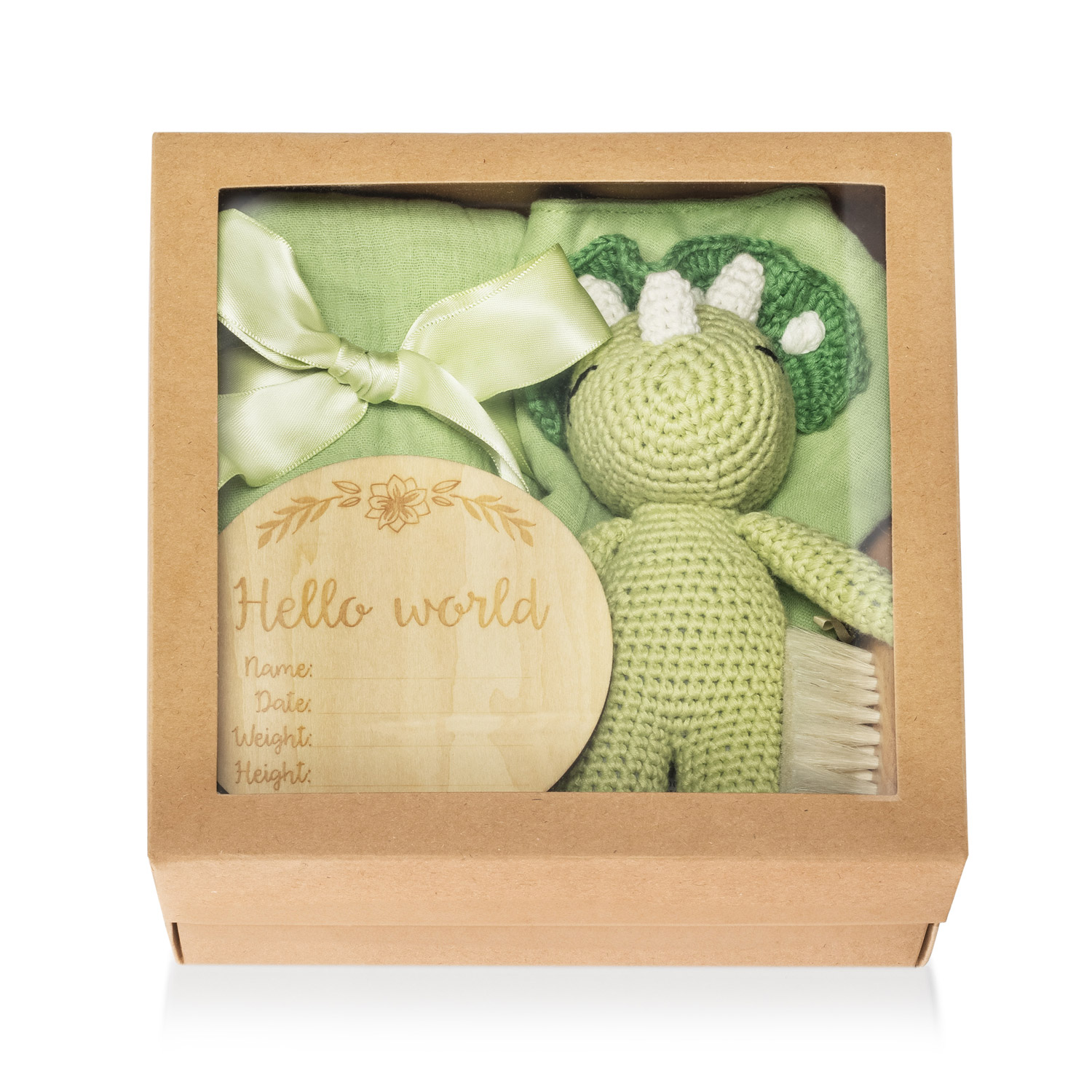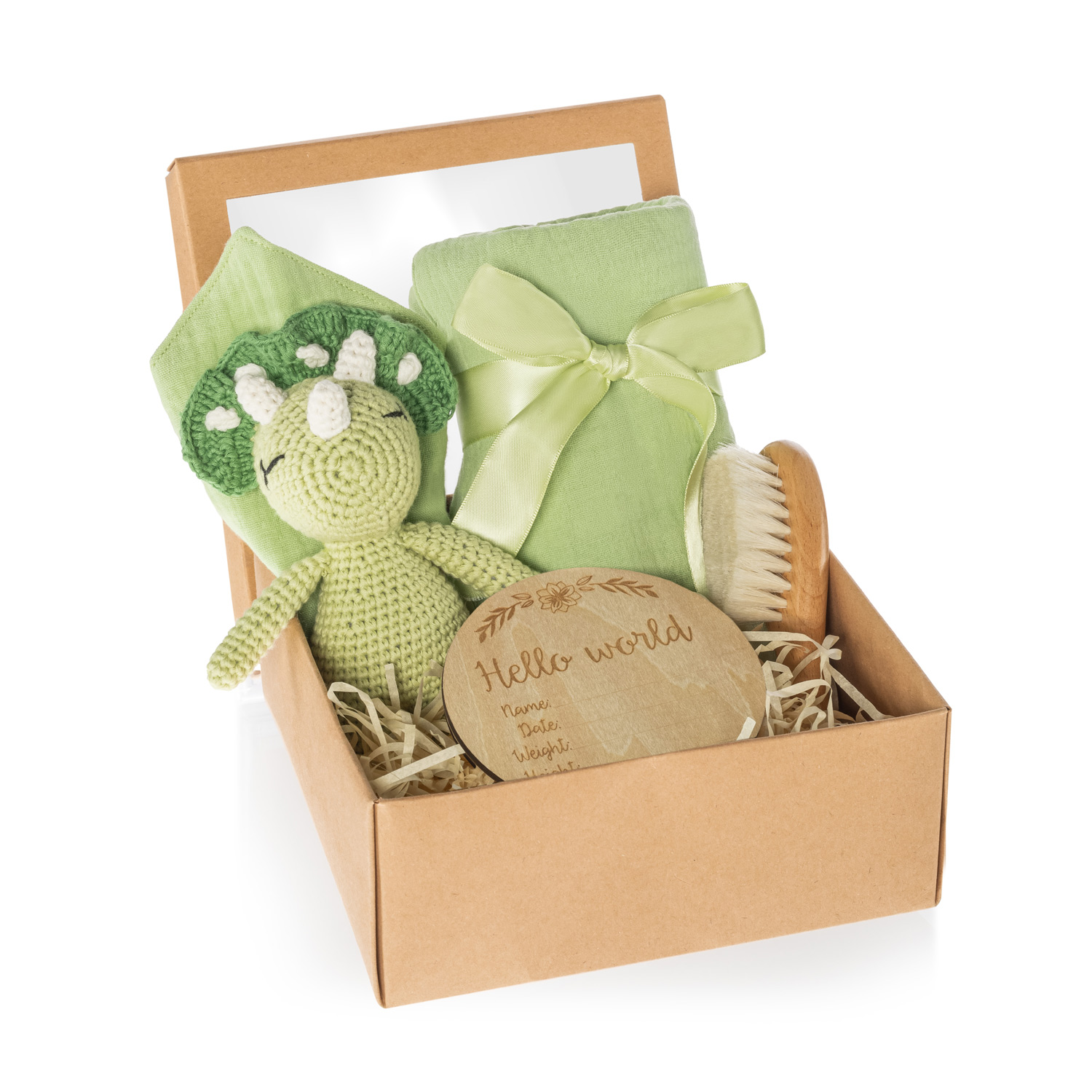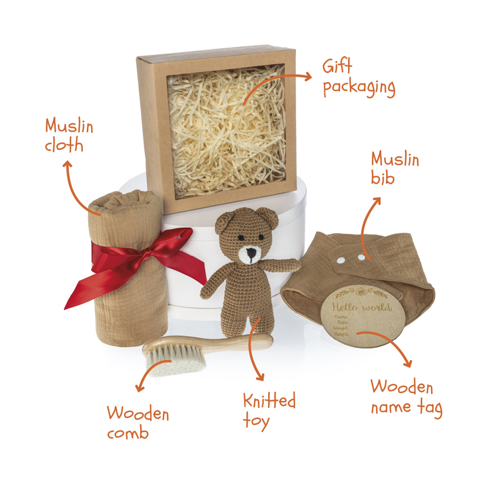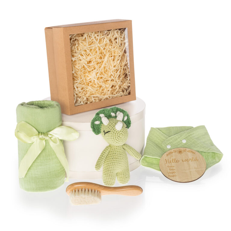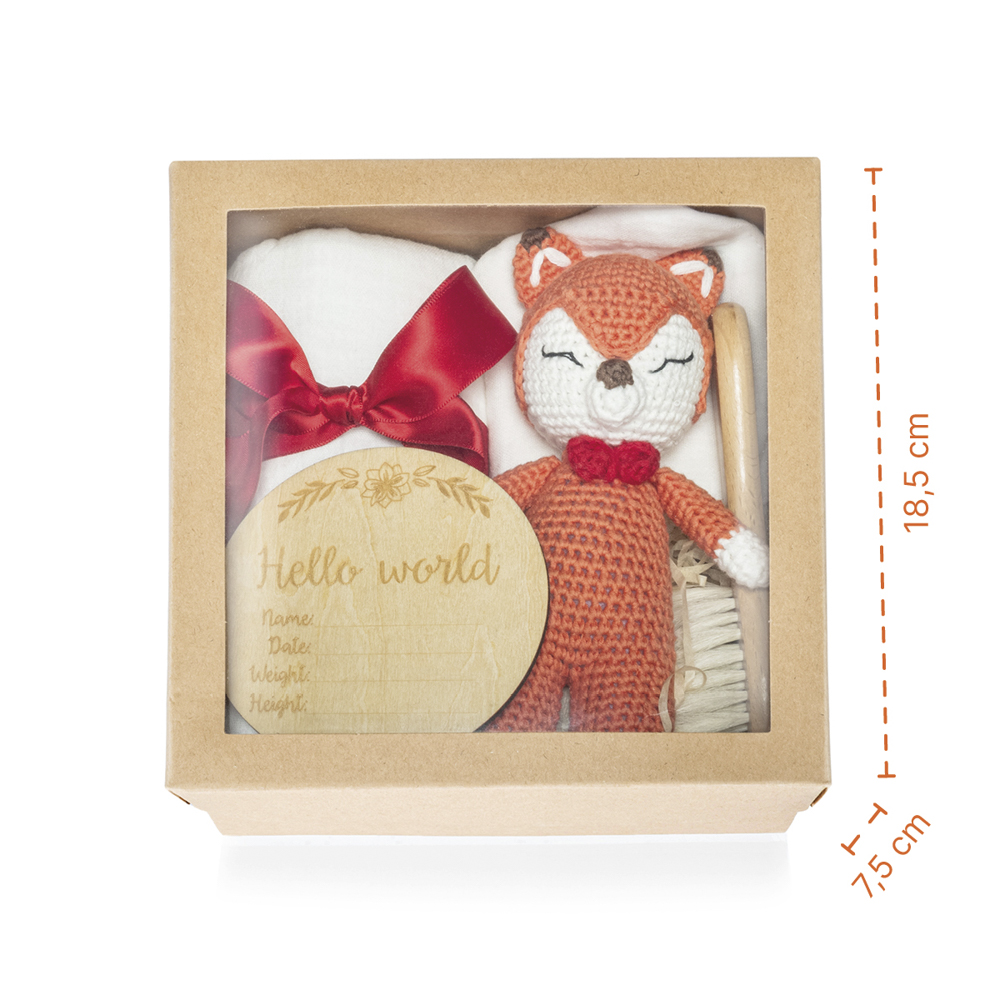Elegantná darčeková krabička pre novorodenca v prírodnom štýle. Obsahuje ručne háčkovanú hračku, mäkučkú mušelínovú plienku, jemnú kefku z prírodných štetín šetrnú k citlivej detskej pokožke, slintáčik a drevenú pamätnú kartičku Hello World na zaznamenanie prvých údajov o bábätku.