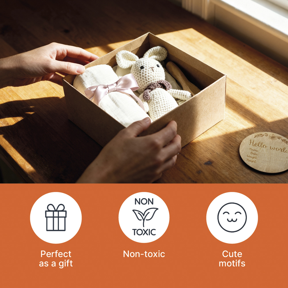 Elegantná darčeková sada pre bábätko v prírodnom štýle obsahuje ručne háčkovanú hračku, mušelínovú plienku, jemnú kefku, slintáčik a drevenú kartičku Hello World – ideálny darček k narodeniu dieťaťa, krstinám či baby shower.